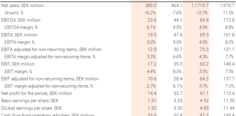 - EBITA SEK 19.5 million (41.6), adjusted for non-recurring items SEK 12.8 million (30.7)
