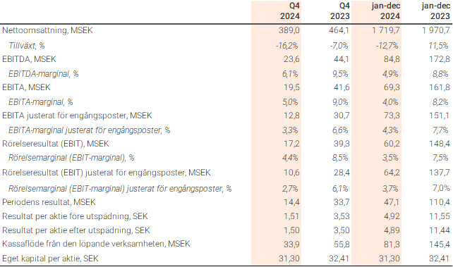 För segmentet Sverige uppgick nettoomsättningen i kvartalet till 75,6 MSEK, en minskning med 33,2 procent jämfört med samma kvartal föregående år. EBITA-resultatet var, i likhet med de två föregående kvartalen, negativt; -1,5 MSEK. För helåret uppgick nettoomsättningen i Sverige till 333,1 MSEK, en minskning med 31,4 procent jämfört med 2023, och EBITA-resultatet till -5,6 (29,1) MSEK.